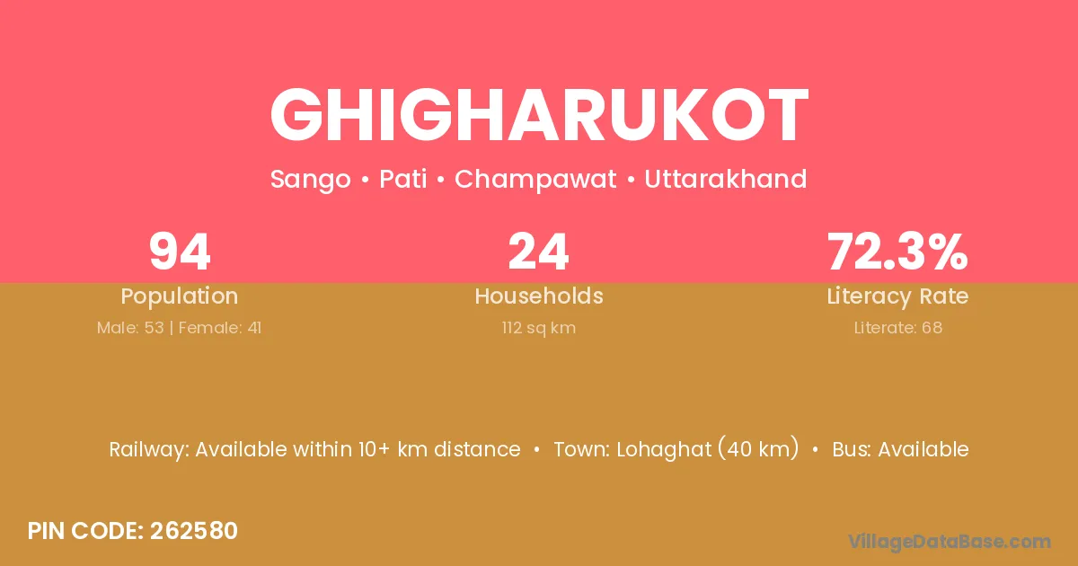Ghigharukot village has a total population of 94 people, of which 53 are males and 41 are females.