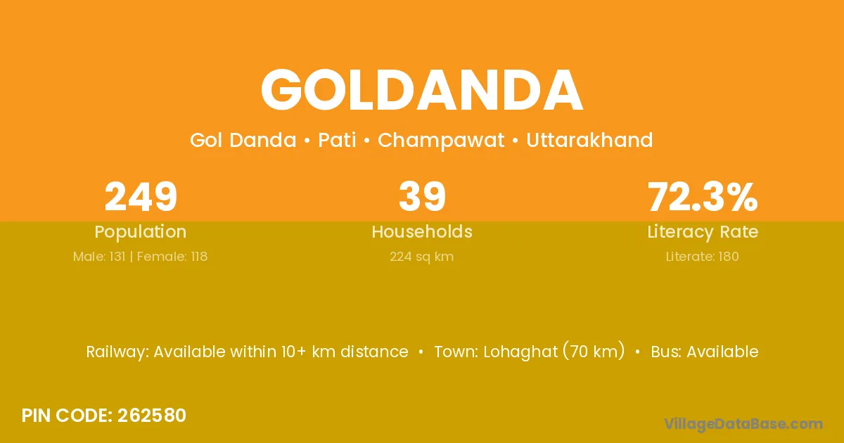 Lohaghat (70 km) is the nearest town to Goldanda village for major economic activities and is located approximately 70 km away.