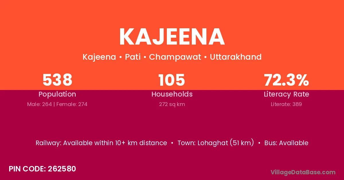 Lohaghat (51 km) is the nearest town to Kajeena village for major economic activities and is located approximately 51 km away.