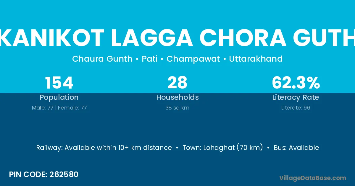 Kanikot Lagga Chora Guth village has a total population of 154 people, of which 77 are males and 77 are females.