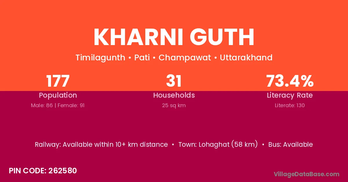 Lohaghat (58 km) is the nearest town to Kharni Guth village for major economic activities and is located approximately 58 km away.