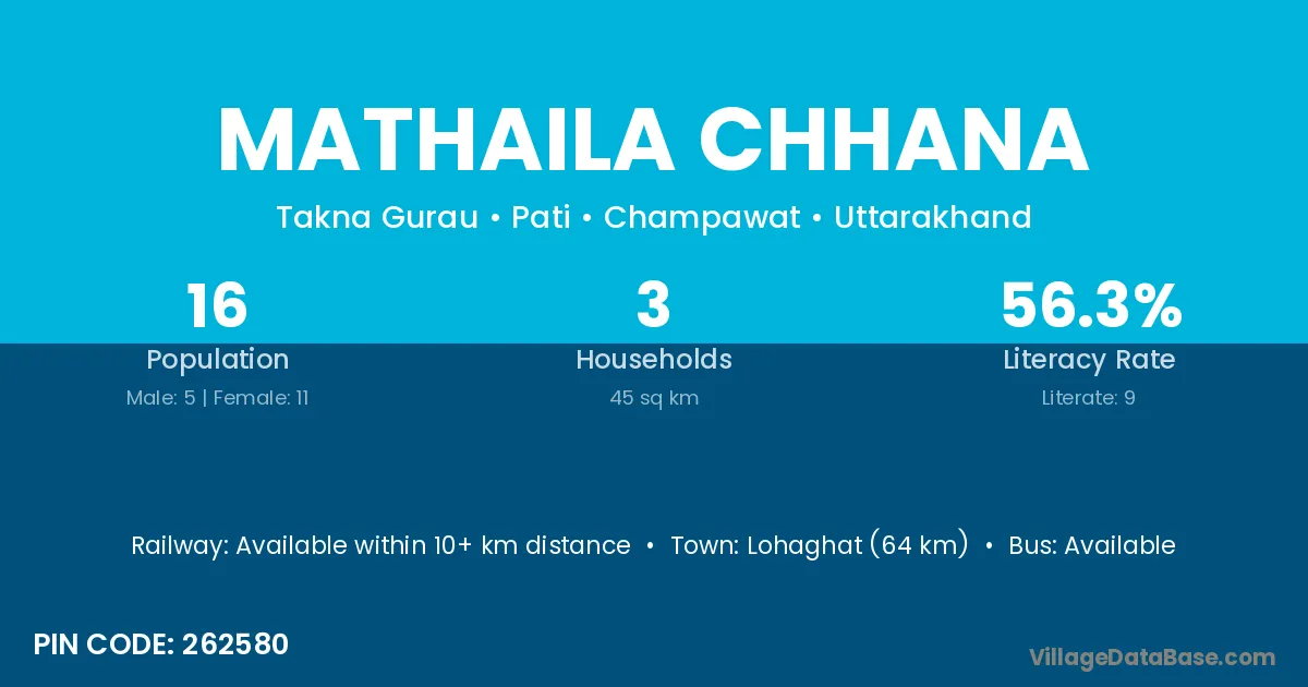 Lohaghat (64 km) is the nearest town to Mathaila Chhana village for major economic activities and is located approximately 64 km away.
