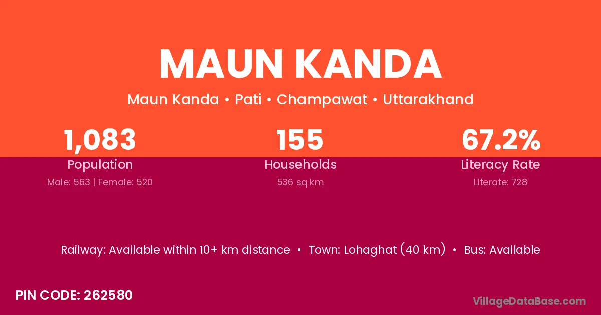 Lohaghat (40 km) is the nearest town to Maun Kanda village for major economic activities and is located approximately 40 km away.