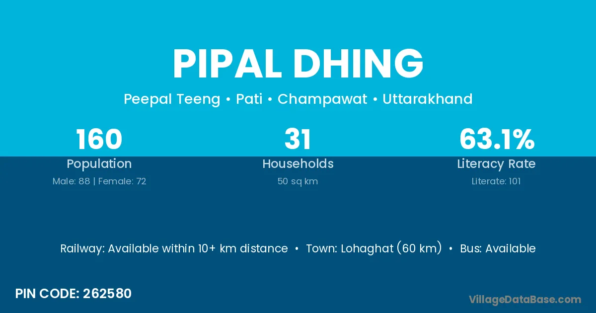 Lohaghat (60 km) is the nearest town to Pipal Dhing village for major economic activities and is located approximately 60 km away.