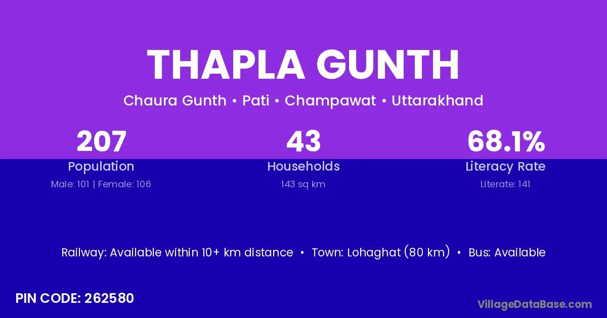 Lohaghat (80 km) is the nearest town to Thapla Gunth village for major economic activities and is located approximately 80 km away.