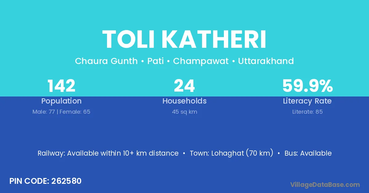 Lohaghat (70 km) is the nearest town to Toli Katheri village for major economic activities and is located approximately 70 km away.