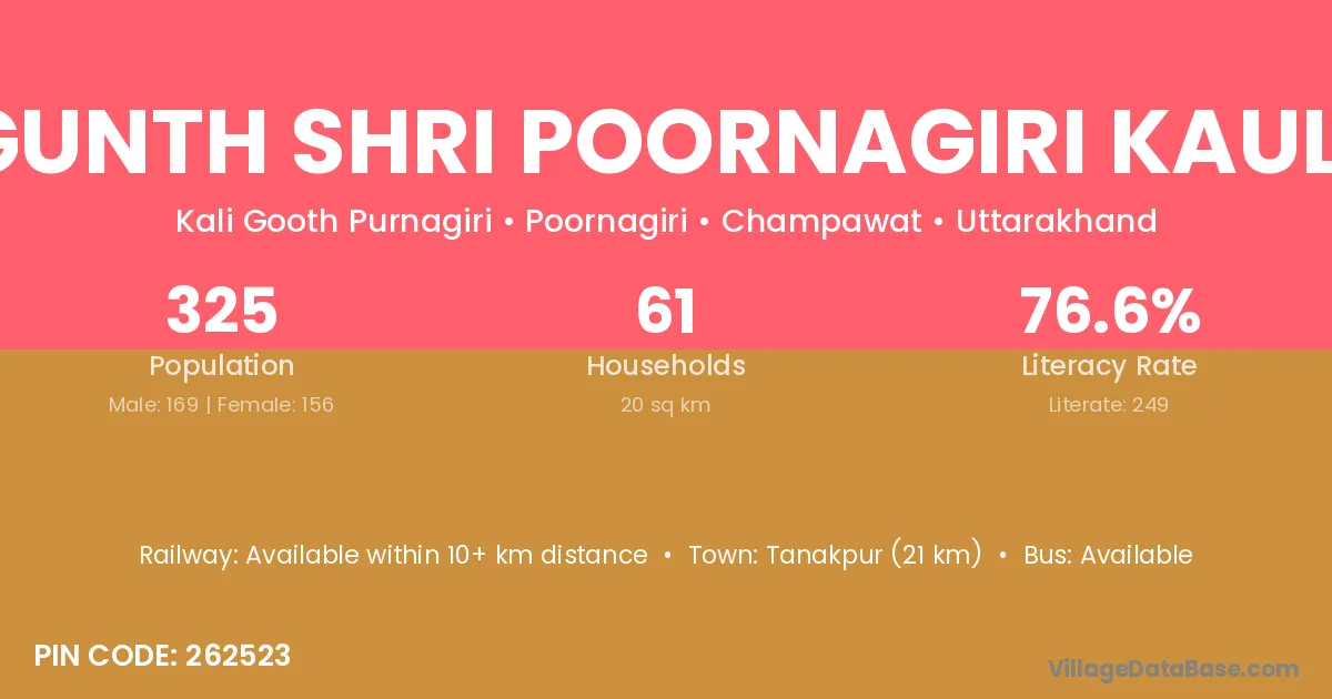 Tanakpur (21 km) is the nearest town to Bageligunth Shri Poornagiri Kaulikulari village for major economic activities and is located approximately 21 km away.
