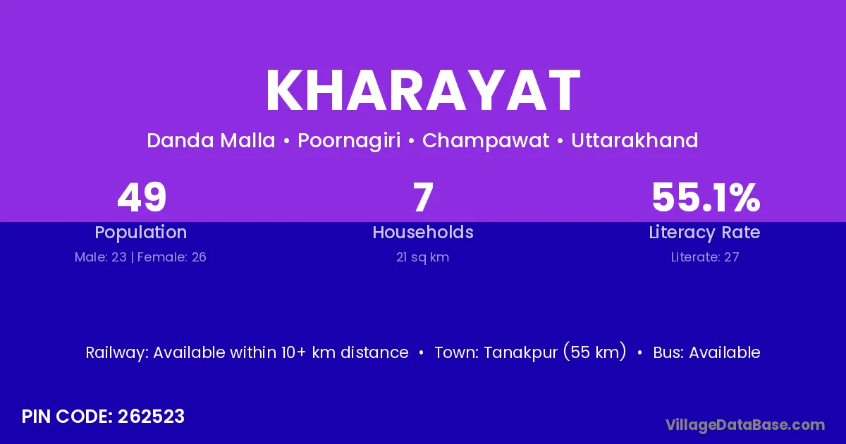 Tanakpur (55 km) is the nearest town to Kharayat village for major economic activities and is located approximately 55 km away.