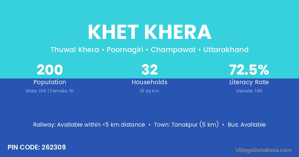 Tanakpur (5 km) is the nearest town to Khet Khera village for major economic activities and is located approximately 5 km away.