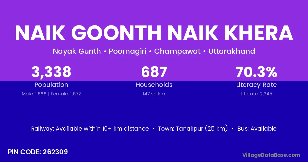 Tanakpur (25 km) is the nearest town to Naik Goonth Naik Khera village for major economic activities and is located approximately 25 km away.