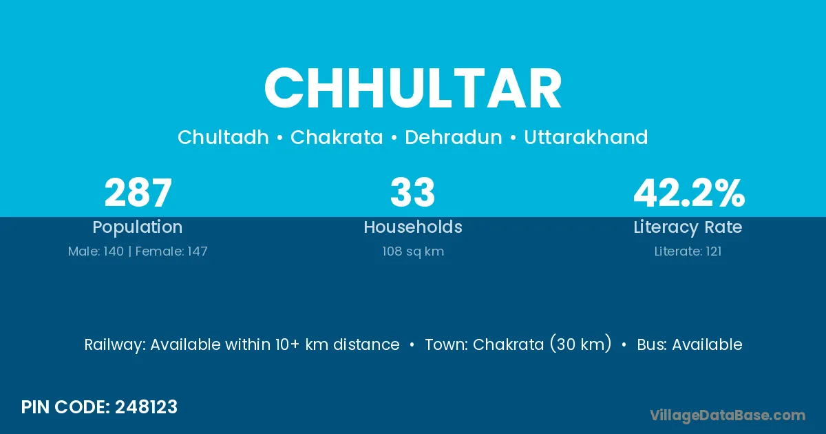 Chakrata (30 km) is the nearest town to Chhultar village for major economic activities and is located approximately 30 km away.