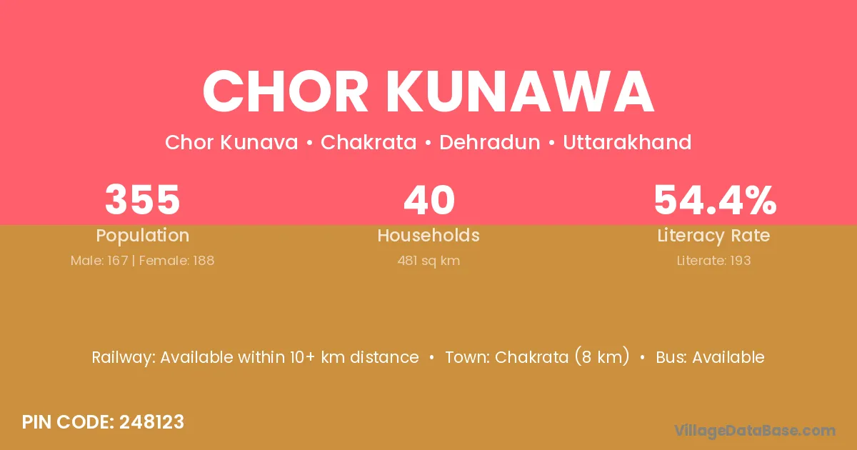 Chakrata (8 km) is the nearest town to Chor Kunawa village for major economic activities and is located approximately 8 km away.
