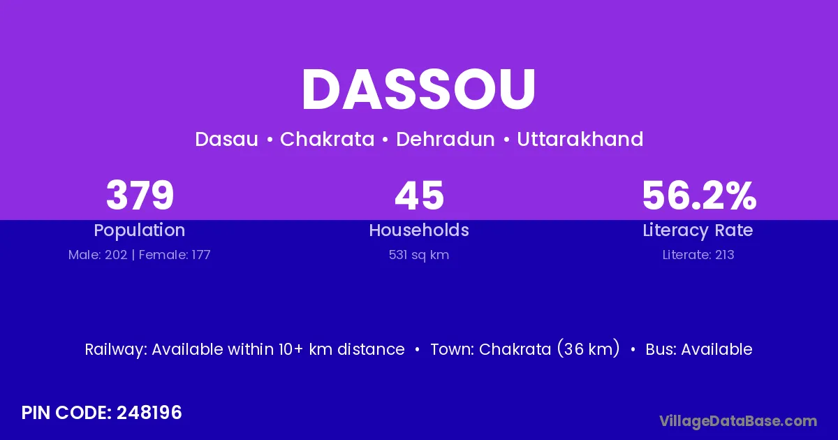Chakrata (36 km) is the nearest town to Dassou village for major economic activities and is located approximately 36 km away.