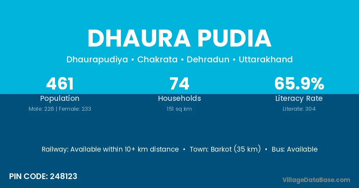 Barkot (35 km) is the nearest town to Dhaura Pudia village for major economic activities and is located approximately 35 km away.