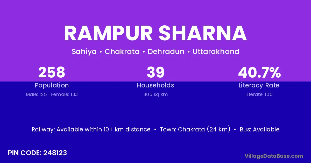 Chakrata (24 km) is the nearest town to Rampur Sharna village for major economic activities and is located approximately 24 km away.