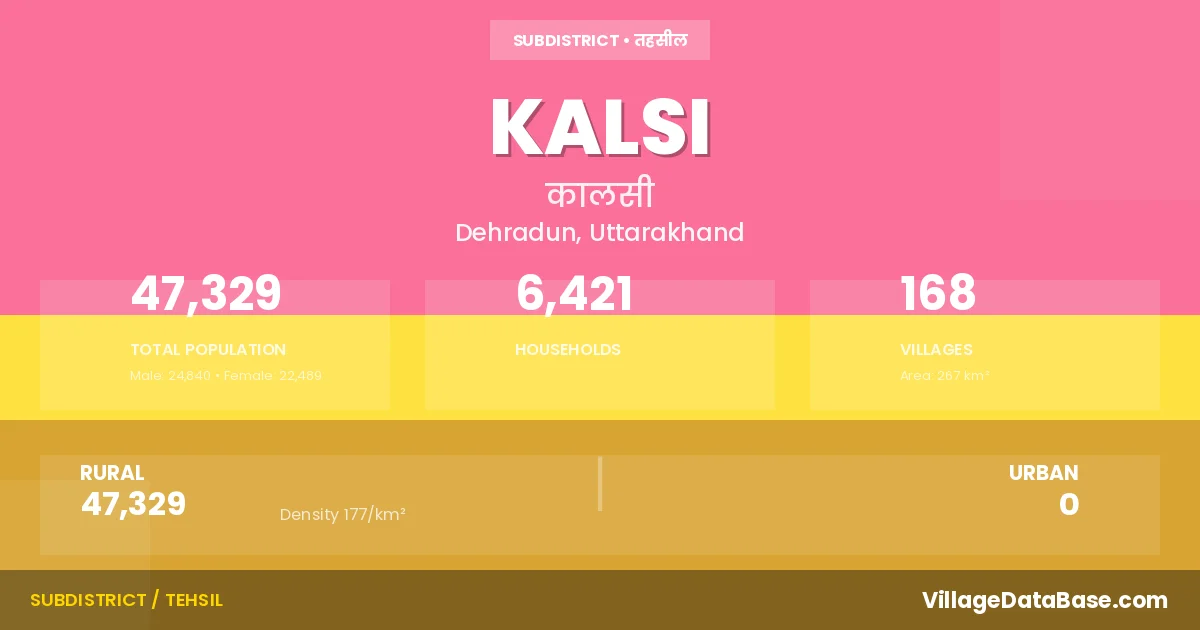 According to the 2011 census The total area of Kalsi Tehsil is 267 km², with a population of 47329 people. The population density is 177 inhabitants per square kilometre, and there are approximately 6421 houses in the sub district.