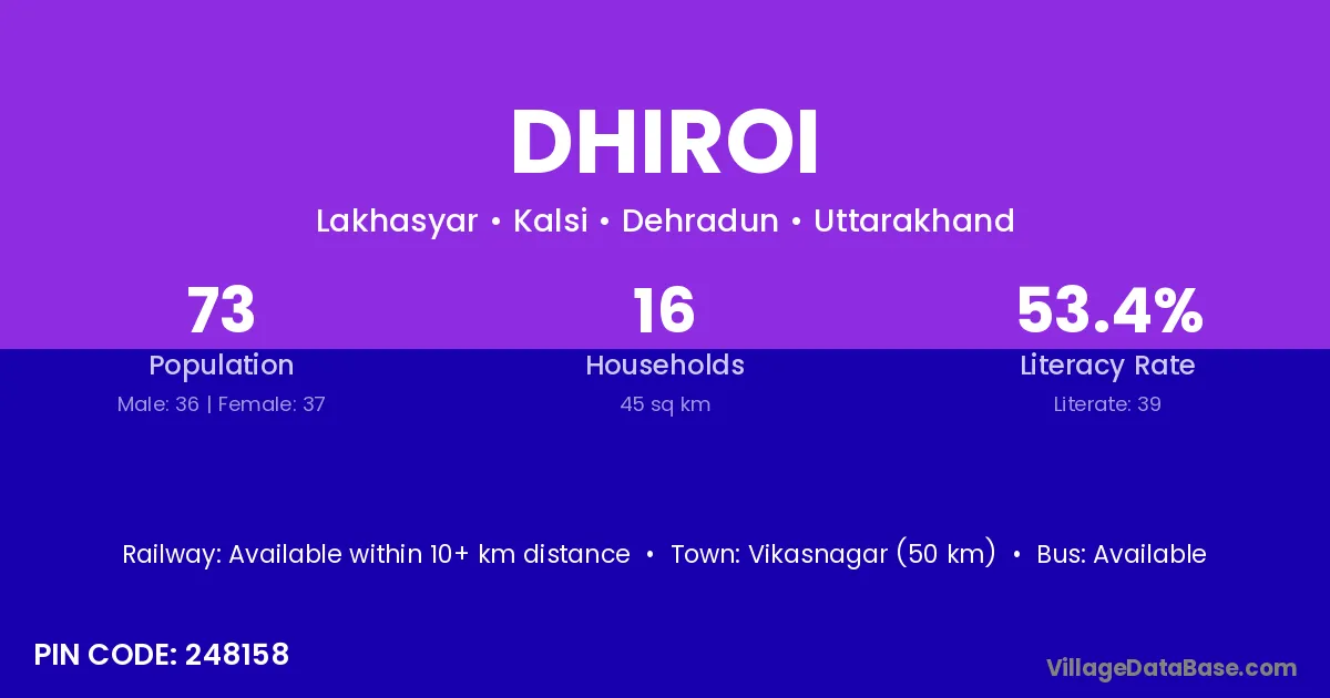 Vikasnagar (50 km) is the nearest town to Dhiroi village for major economic activities and is located approximately 50 km away.