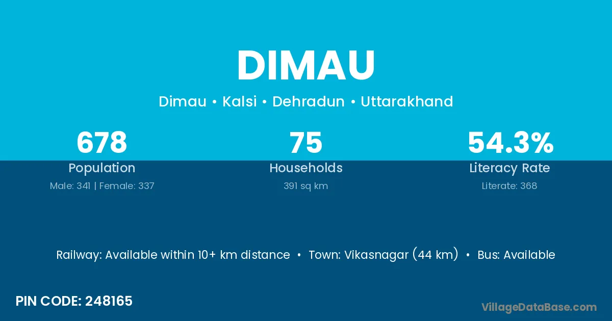 Vikasnagar (44 km) is the nearest town to Dimau village for major economic activities and is located approximately 44 km away.