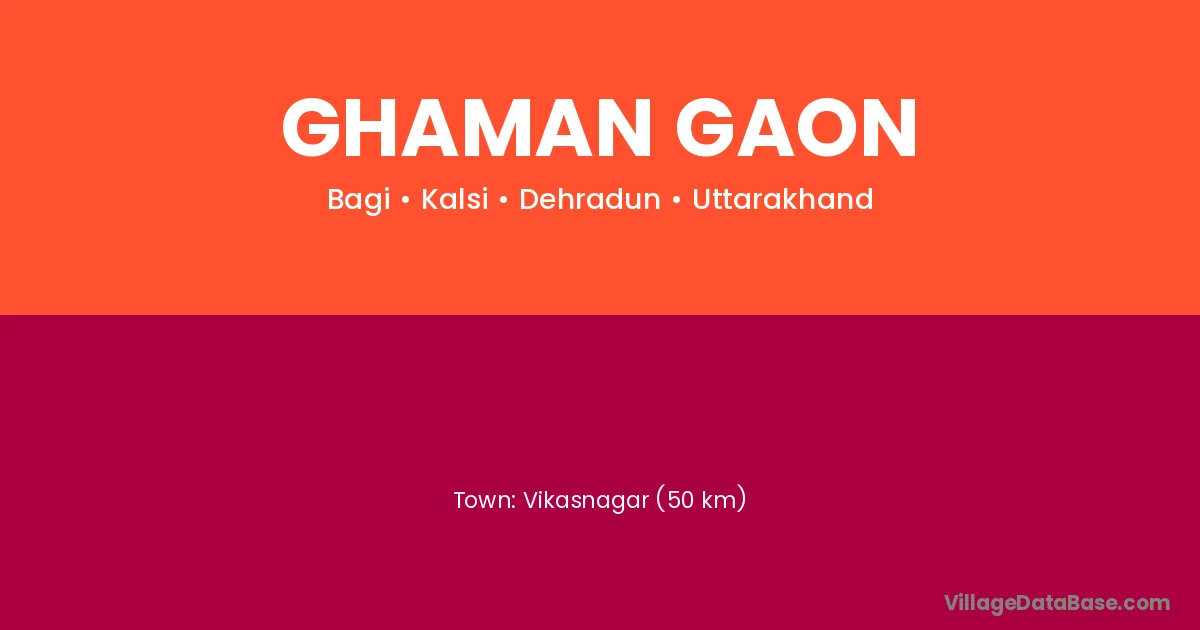 Vikasnagar (50 km) is the nearest town to Ghaman Gaon village for major economic activities and is located approximately 50 km away.