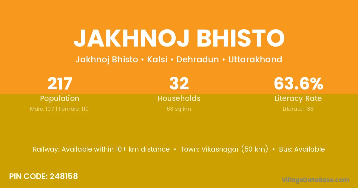 Vikasnagar (50 km) is the nearest town to Jakhnoj Bhisto village for major economic activities and is located approximately 50 km away.