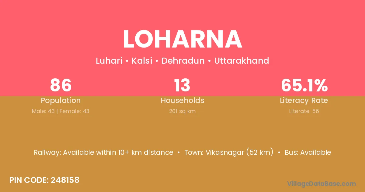 Vikasnagar (52 km) is the nearest town to Loharna village for major economic activities and is located approximately 52 km away.