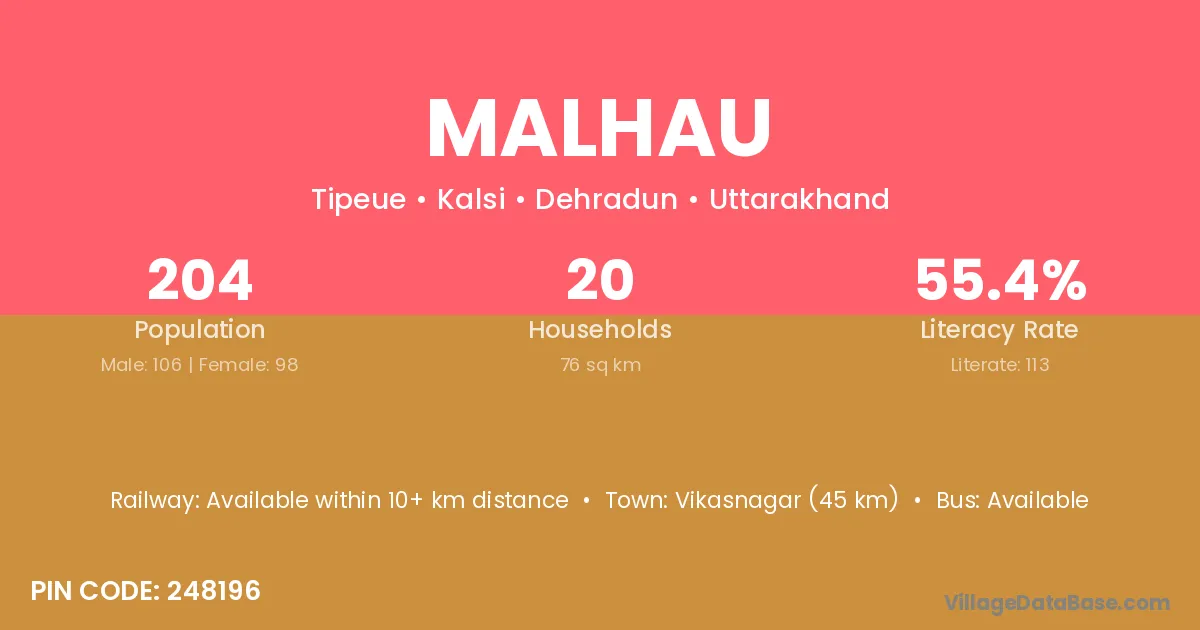Vikasnagar (45 km) is the nearest town to Malhau village for major economic activities and is located approximately 45 km away.