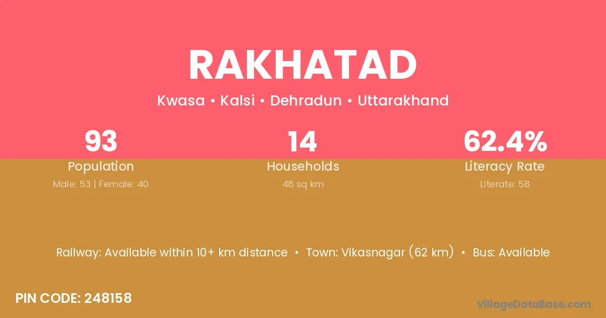 Vikasnagar (62 km) is the nearest town to Rakhatad village for major economic activities and is located approximately 62 km away.