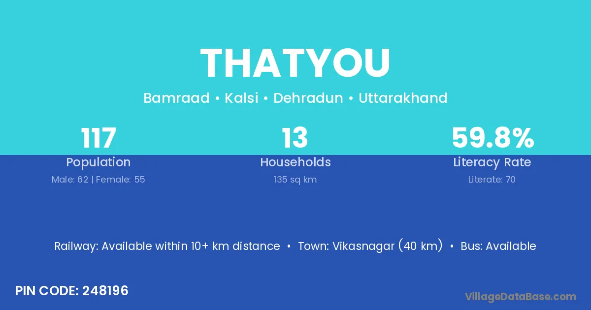 Vikasnagar (40 km) is the nearest town to Thatyou village for major economic activities and is located approximately 40 km away.