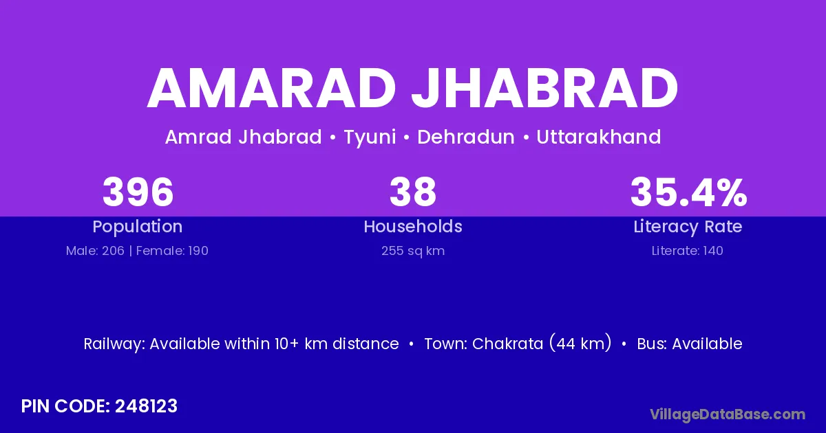 Chakrata (44 km) is the nearest town to Amarad Jhabrad village for major economic activities and is located approximately 44 km away.
