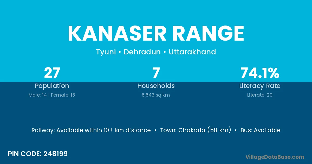 Chakrata (58 km) is the nearest town to Kanaser Range village for major economic activities and is located approximately 58 km away.