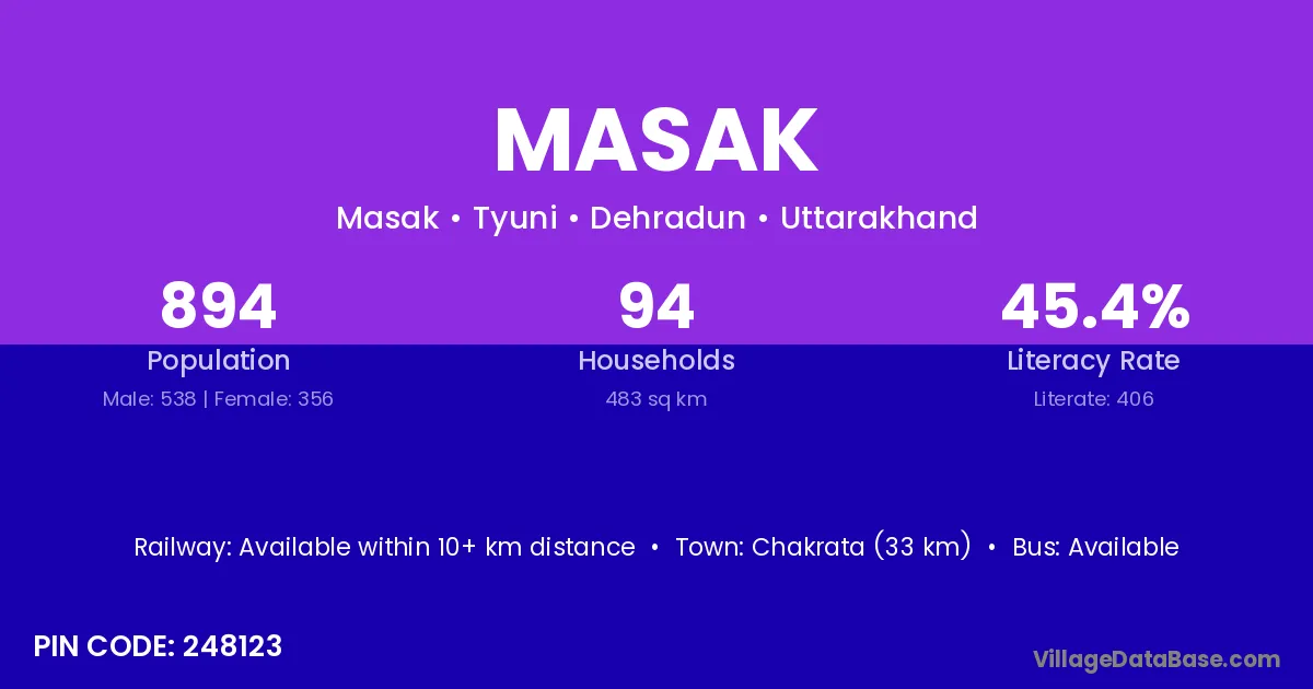 Chakrata (33 km) is the nearest town to Masak village for major economic activities and is located approximately 33 km away.