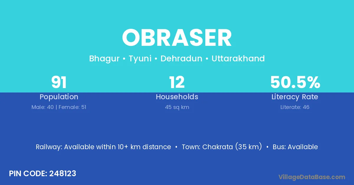 Chakrata (35 km) is the nearest town to Obraser village for major economic activities and is located approximately 35 km away.