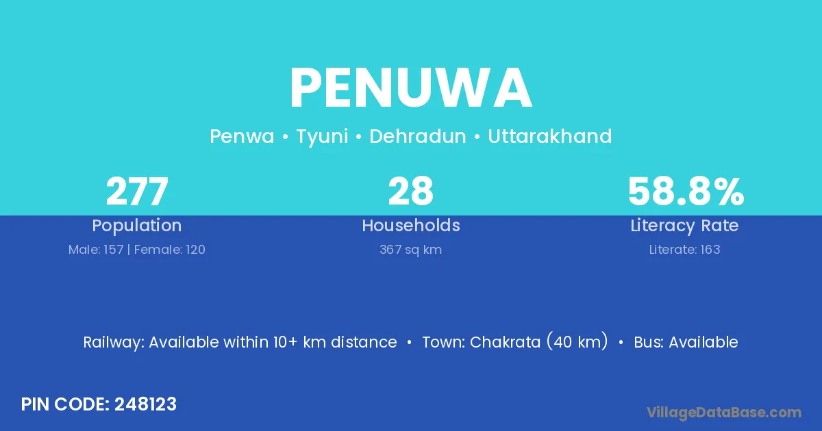 Chakrata (40 km) is the nearest town to Penuwa village for major economic activities and is located approximately 40 km away.