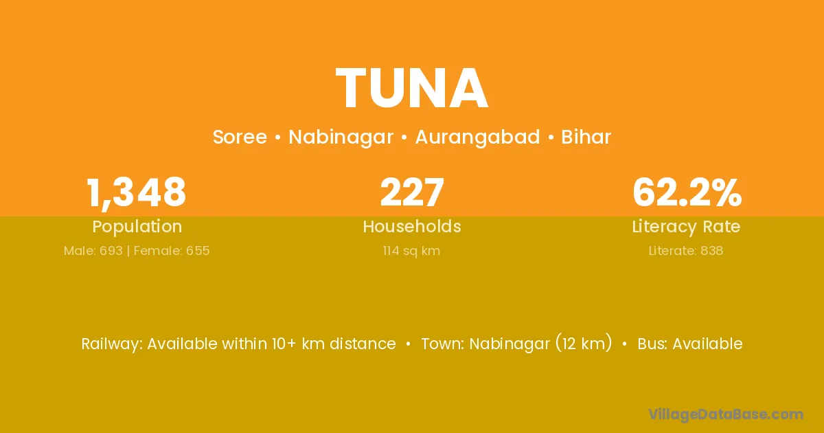 The literacy rate of Tuna village is 69.46%. Male literacy stands at 78.95% and female literacy at 59.59%.