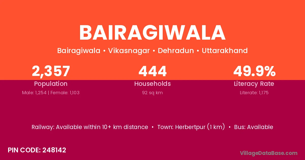 Herbertpur (1 km) is the nearest town to Bairagiwala village for major economic activities and is located approximately 1 km away.