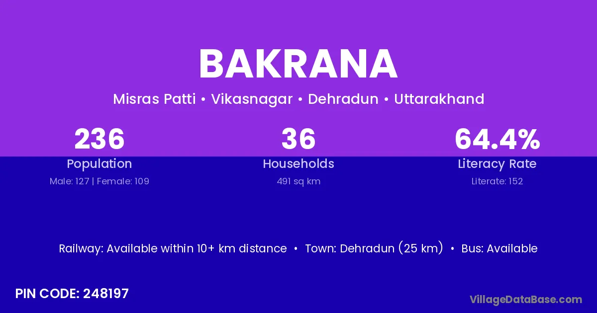 Dehradun (25 km) is the nearest town to Bakrana village for major economic activities and is located approximately 25 km away.