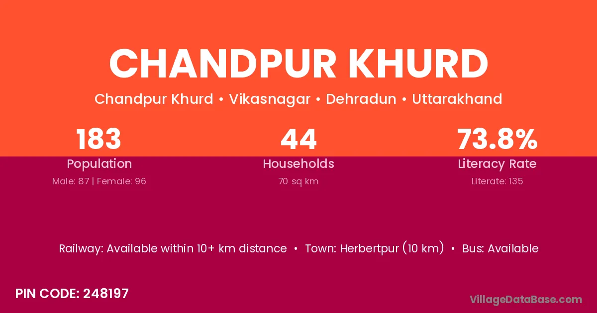 Chandpur Khurd village has a total population of 183 people, of which 87 are males and 96 are females.