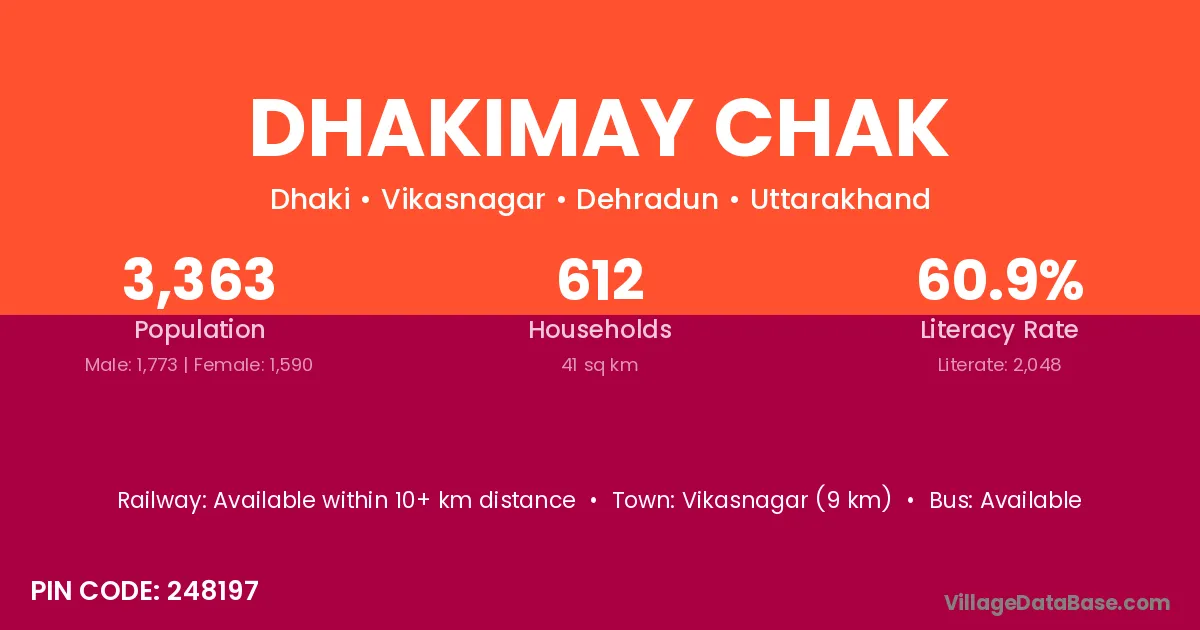 Vikasnagar (9 km) is the nearest town to Dhakimay Chak village for major economic activities and is located approximately 9 km away.