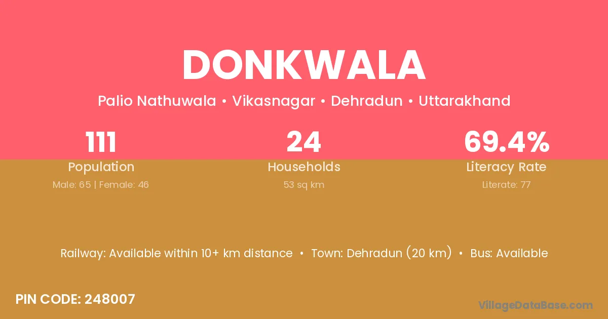 Dehradun (20 km) is the nearest town to Donkwala village for major economic activities and is located approximately 20 km away.