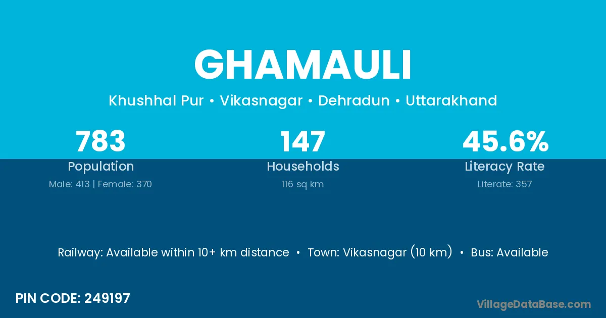 Vikasnagar (10 km) is the nearest town to Ghamauli village for major economic activities and is located approximately 10 km away.