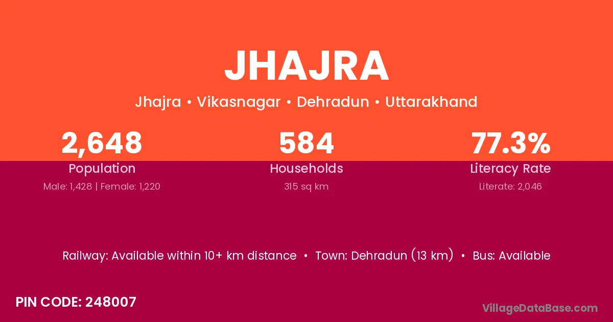 Dehradun (13 km) is the nearest town to Jhajra village for major economic activities and is located approximately 13 km away.