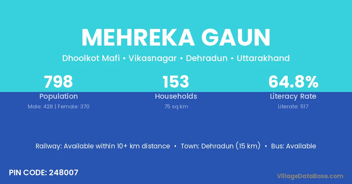 Dehradun (15 km) is the nearest town to Mehreka Gaun village for major economic activities and is located approximately 15 km away.