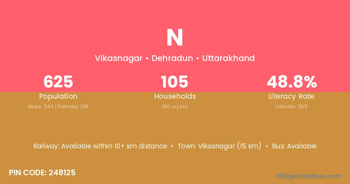 Vikasnagar (15 km) is the nearest town to N village for major economic activities and is located approximately 15 km away.