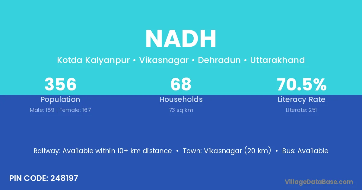 Vikasnagar (20 km) is the nearest town to Nadh village for major economic activities and is located approximately 20 km away.