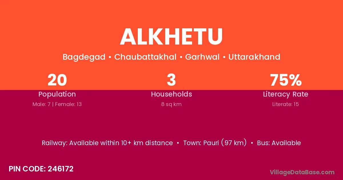 Pauri (97 km) is the nearest town to Alkhetu village for major economic activities and is located approximately 97 km away.