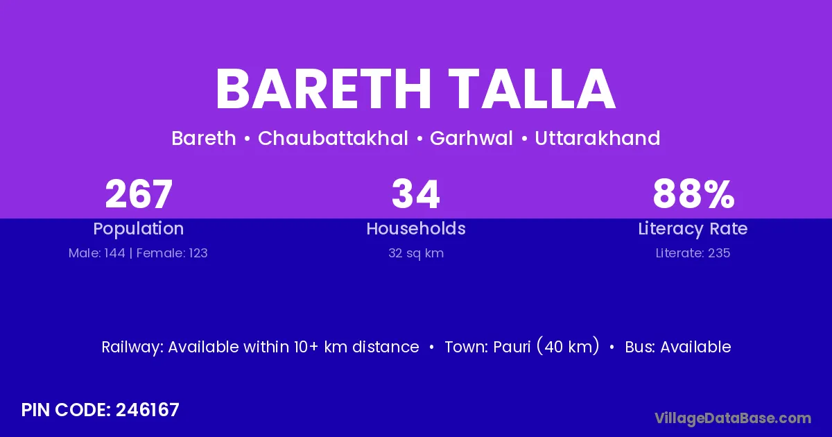Pauri (40 km) is the nearest town to Bareth Talla village for major economic activities and is located approximately 40 km away.