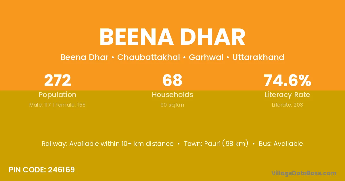 Pauri (98 km) is the nearest town to Beena Dhar village for major economic activities and is located approximately 98 km away.