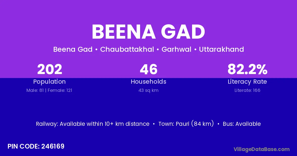 Pauri (84 km) is the nearest town to Beena Gad village for major economic activities and is located approximately 84 km away.