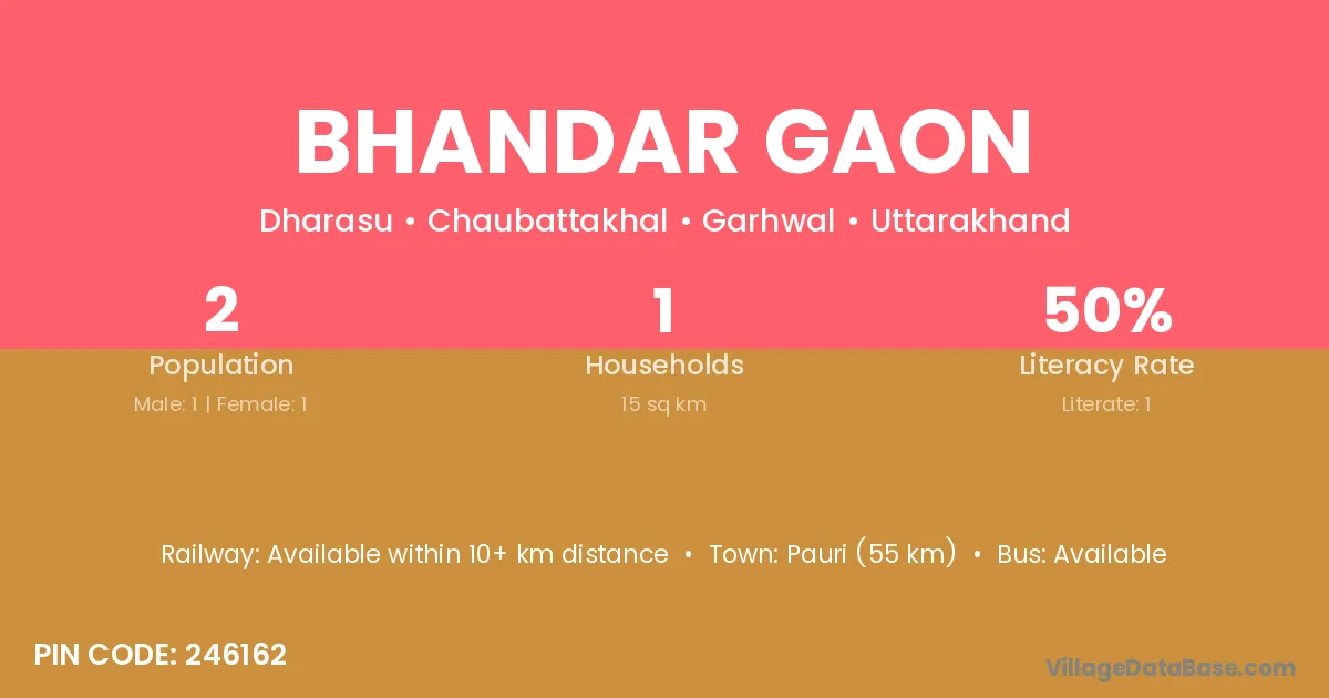 Pauri (55 km) is the nearest town to Bhandar Gaon village for major economic activities and is located approximately 55 km away.