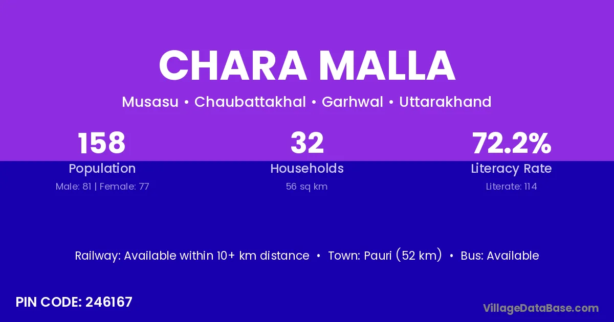 Pauri (52 km) is the nearest town to Chara Malla village for major economic activities and is located approximately 52 km away.